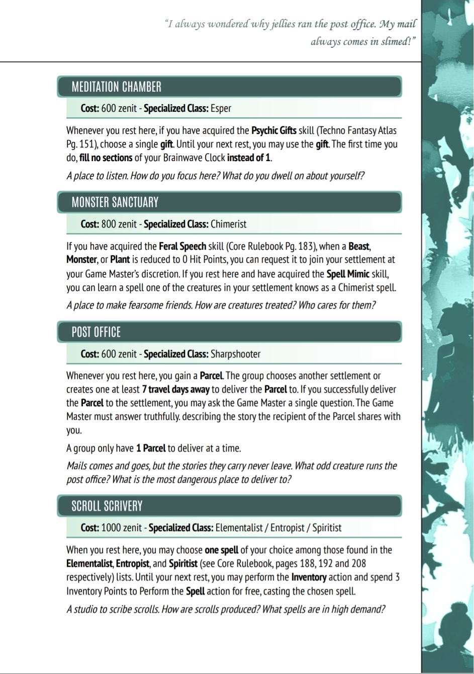 Inspired by the likes of Bravely Default and Everoasis, Cities & Settlements is a base building expansion for Fabula Ultima that focuses on allowing a group to build up a location over time using similar rules to the Project subsystem. In exchange, they'll receive access to camp activities and special actions while visiting the settlement and beyond it as they connect with its growing populace.